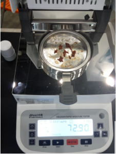 用鑷子提取8克豬肉肉末,置于不銹鋼托盤中,用鑷子將牛肉肉末平鋪均勻,溫度設(shè)置145℃用儀器進(jìn)行加熱,檢測(cè)結(jié)束,檢測(cè)數(shù)據(jù)顯示72.65%;為了檢測(cè)儀器的精確性,待儀器溫度降至50℃以下時(shí)進(jìn)行第二次測(cè)量,用實(shí)驗(yàn)勺提取8克豬肉肉末,置于不銹鋼托盤中,用實(shí)驗(yàn)勺將面粉平鋪均勻,溫度設(shè)置145℃用儀器進(jìn)行加熱,后檢測(cè)結(jié)束,檢測(cè)數(shù)據(jù)顯示72.90%;?用實(shí)驗(yàn)勺提取8克豬肉肉末,置于不銹鋼托盤中,用實(shí)驗(yàn)勺將豬肉平鋪均勻,溫度設(shè)置150℃用儀器進(jìn)行加熱后檢測(cè)結(jié)束,檢測(cè)數(shù)據(jù)顯示72.82%。實(shí)驗(yàn)結(jié)果所得數(shù)值較為準(zhǔn)確,儀器檢測(cè)精度較高。