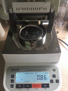 為了使測試過程中電池粉末水分儀將電池粉末烘干烘透,我們將電池粉末分散開來,以便溫度能滲透進電池粉末內部。取7克多電池粉末撒于不銹鋼托盤中,用鑷子將電池粉末平鋪均勻,為避免電池粉末經(jīng)過高溫度加熱后變性,我們將溫度設置在140℃,按“START”鍵開始測試,2分10秒后檢測結束,檢測數(shù)據(jù)顯示272%;