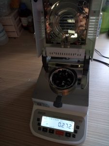 3、平衡后將樣品瓶移出,取出樣品,用電子天平稱取樣品置于樣品瓶內,然后在水分儀上點擊開始測量,同時將樣品瓶裝入加熱槽。