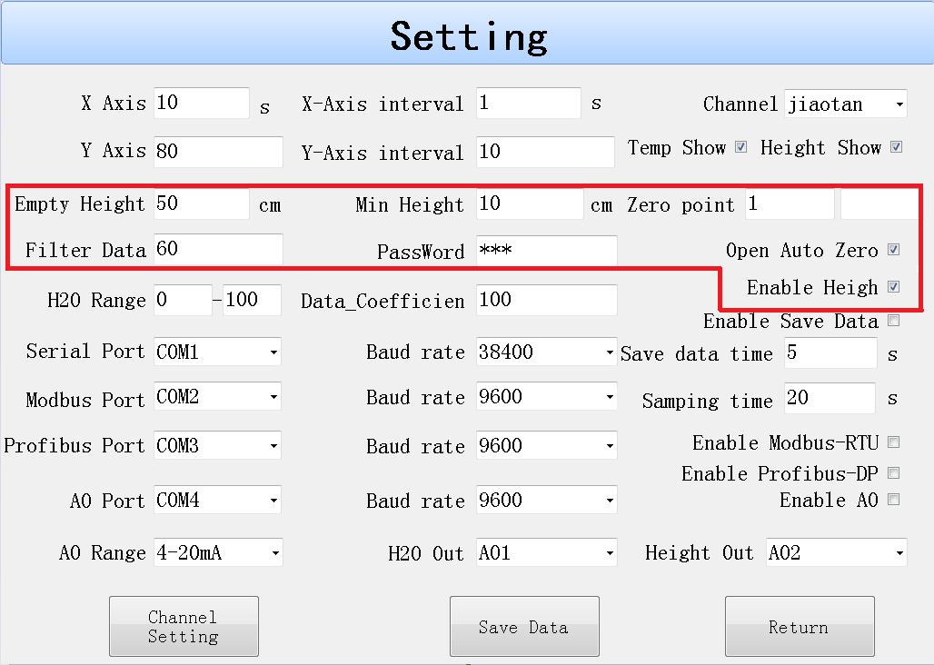Empty Height:空料高度(模擬量輸出最大值為空料高度,最小值為0)