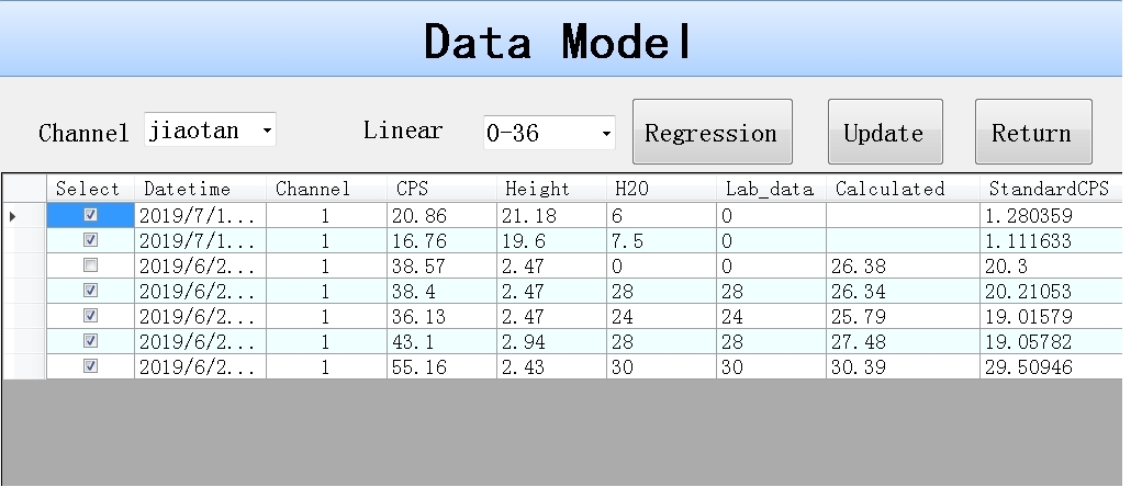 在數(shù)據(jù)列表中select選中的需要參與建立線性的數(shù)據(jù)(在前方框中打勾)。輸入Lab_data數(shù)據(jù)(對(duì)應(yīng)的實(shí)驗(yàn)室化驗(yàn)數(shù)據(jù)),每輸入一次需要點(diǎn)擊Updte按鈕更改一次。然后點(diǎn)擊當(dāng)前頁(yè)面 Regression,進(jìn)入下圖: